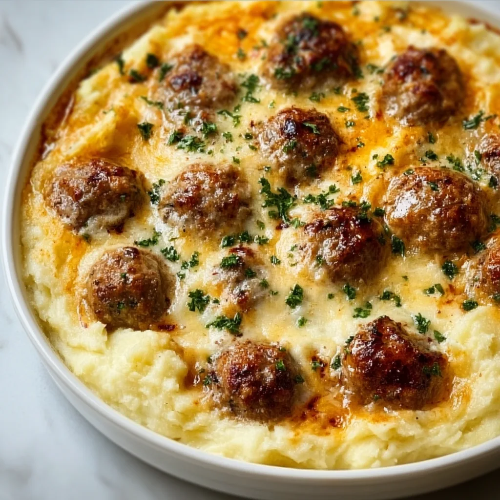 This meatball and mashed potato bake is loaded with juicy homemade or store-bought meatballs, fluffy mashed potatoes, savory brown gravy, and melty cheese. Baked until bubbly and golden, it’s pure comfort in every bite.