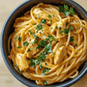 A beautifully styled bowl of creamy Crockpot Chicken Spaghetti, garnished and ready to serve, perfect for article headers and Pinterest pins